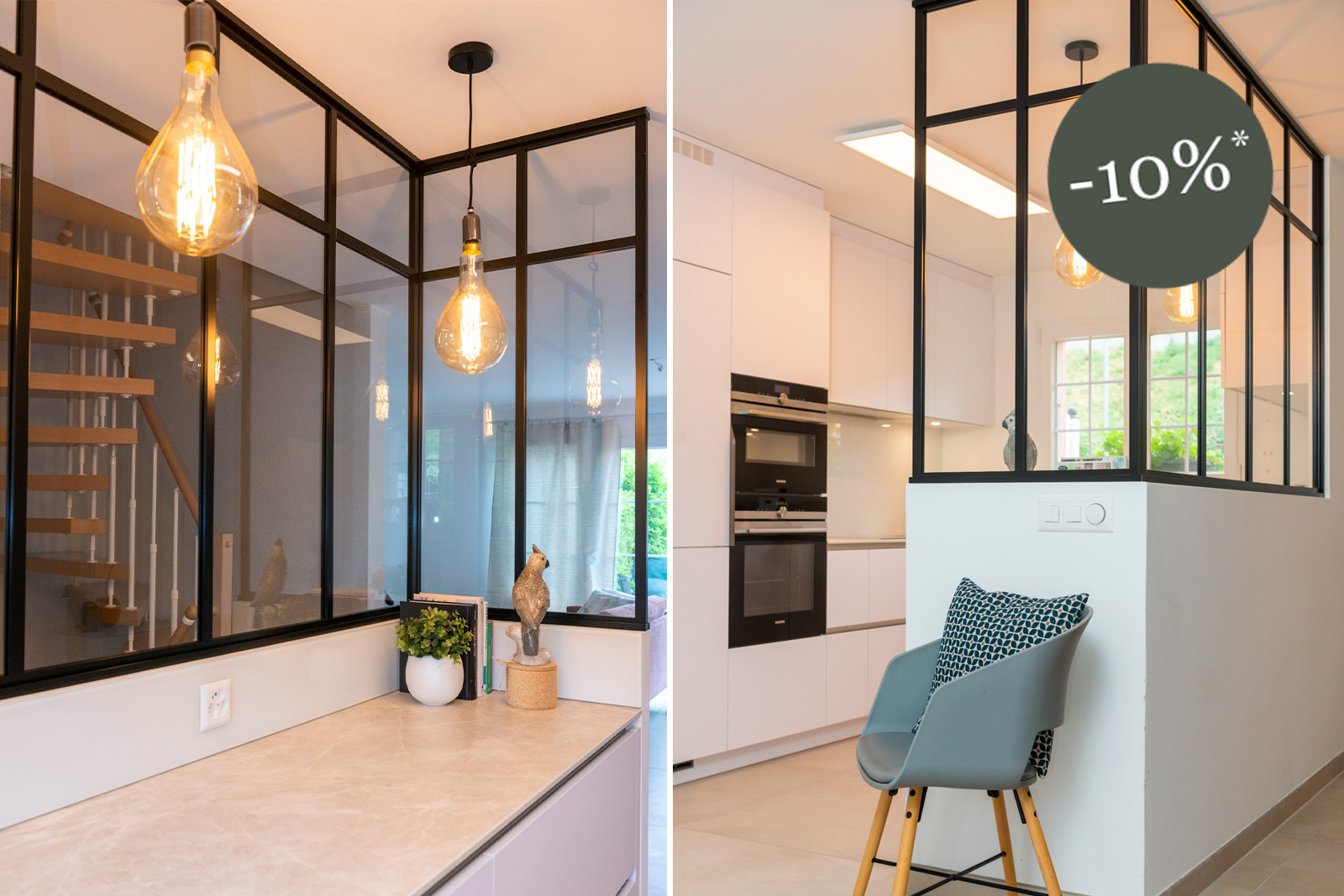 Une solution idéale pour les cuisines, bureaux ou salles de bain sans fenêtres. Jusqu’au 30 août, profitez de -10 %* sur votre projet de verrière sur mesure !