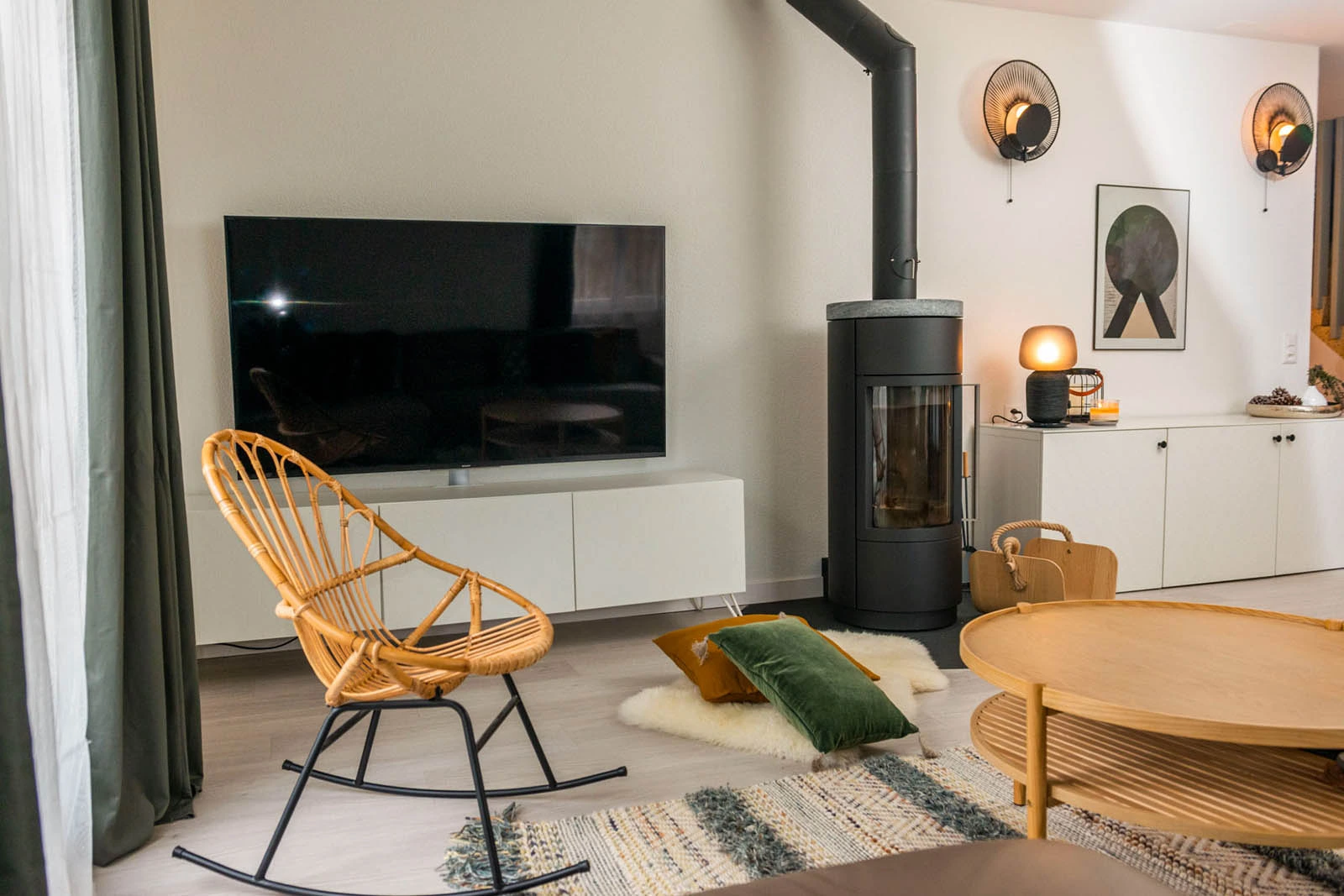 Un style moderne à été voulu pour cette maison tout en apportant de la chaleur grâce au bois, au dynamisme des couleurs, vert, gris, et au papier peint végétal. Le mobilier actuel se veut moderne, à tendance scandinave.